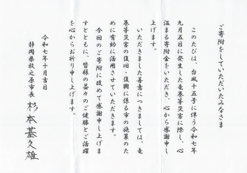 2025年9月5日に発生した台風15号の被害に対する義援金として、静岡県牧之原市へ寄付金をお送りしました。