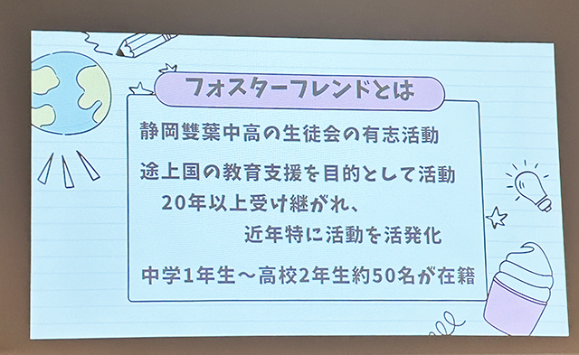 静岡市葵区にある雙葉学園中学校・高等学校様では、生徒会の有志が途上国の教育支援を目的として20年以上にわたりこの「フォスターフレンド」活動を実施されております。