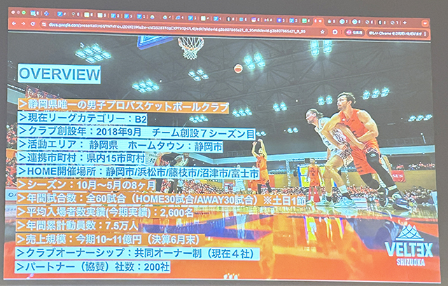 今回は男子プロバスケットボールチーム「VELTEX SHIZUOKA」を運営する株式会社VELTEXスポーツエンタープライズ代表取締役社長松永康太様にご登壇いただきました。